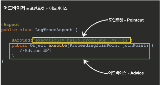 - @Aspect는 관점 지향 프로그래밍(AOP)을 가능하게 하는 AspectJ 프로젝트에서 제공하는 애노테이션이다