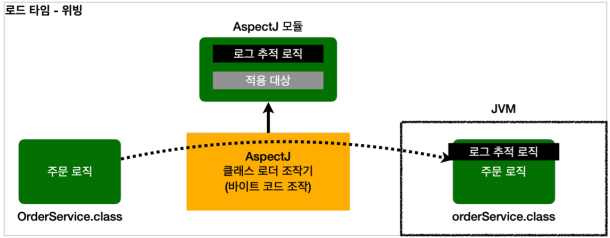 - 클래스 로딩 시점 : 실제 대상 코드에 애스팩트를 통한 부가 기능 호출 코드가 포함된다. AspectJ를 직접 사용해야 한다