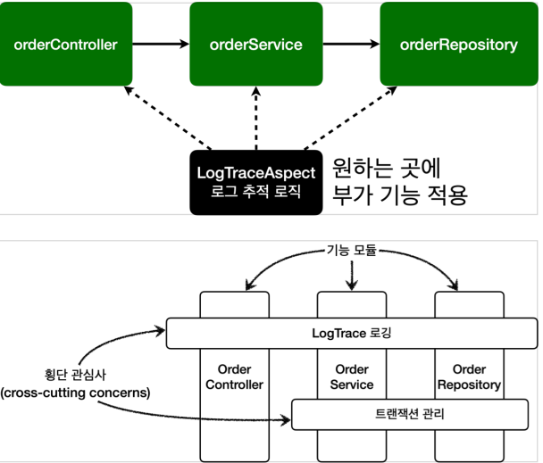- 예를 들어서 로그 추적 기능은 어떤 핵심 기능이 호출되었는지 로그를 남기기 위해 사용한다