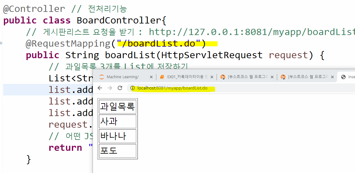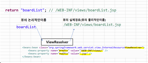 뷰의 실제경로( 뷰의 물리적인이름 ) : /WEB-INF/views/boardList.jsp