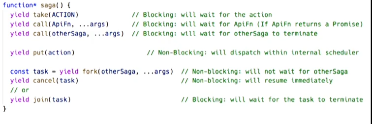 function* fetchSaga() { const result = yield call(api.fetchA, arg1, arg2) console.log(result) }- call은 async-await의 await같은 역할을 한다.