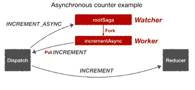 import { put, takeEvery, delay } from 'redux-saga/effects' export default function* rootSaga() { yield takeEvery('INCREMENT_ASYNC', incrementAsync ) } export function* incrementAsync() { yield delay(1000) yield put({ type: 'INCREMNET' }) }- INCREMNET_ASYNC 액션이 발생하면