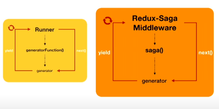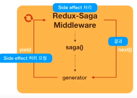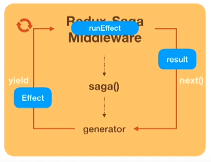 - Saga는 Effect를 yield하고, Middleware는 Effect를 처리한다.