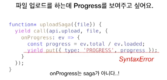 - fork : 다른 saga를 전달( 다른 공간에서 실행될것 )