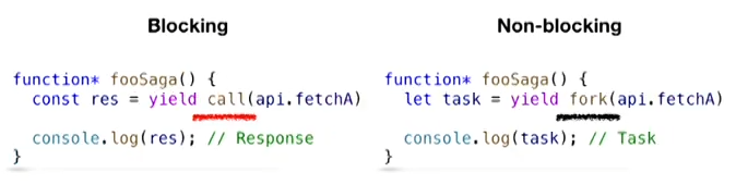 function* fetchSaga() { const result = yield call(api.fetchA, arg1, arg2) console.log(result) }- call은 async-await의 await같은 역할을 한다.