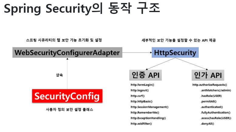 - 인증/인가의 설정을 바꾸고자 한다면 WebSecurityConfigurerAdapter 클래스를 상속한 SecurityConfig클래스를 생성하여 configure(HttpSecurity http) 메서드를 override하며 설정