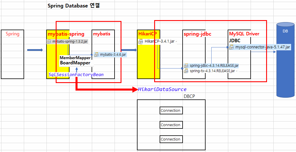 4. sql문을 전달하기 위해서는 SqlSessionFactoryBean이 필요하다.( SqlSessionFactoryBean → HikariDataSource → DB ) -> SqlSessionFactoryBean은 mybastis-spring API에 존재