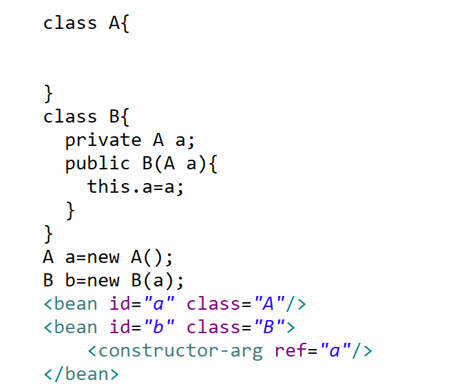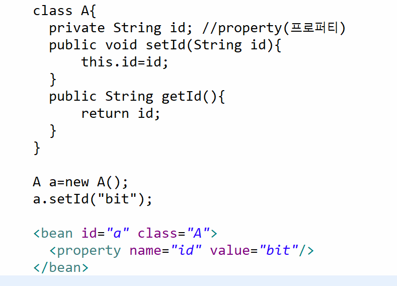 A a = new A(); a.setId("bit"); <bean id=“a” class=“A”> <property name="id" value="bit"/> -> setter메소드를 호출하는 태그 name이라는 변수에 value넣기 </bean> -> 위 아래 같은 의미 ----------------------------------------------------------------------------------------------------- A a = new A(); B b = new B(a); <bean id="a" class="A"/> <bean id="b" class="B"> <constructor-arg ref="a"/> -> 생성자메소드를 호출해라 / ref: a를 참조해라! </bean> -> 위아래 같은 의미