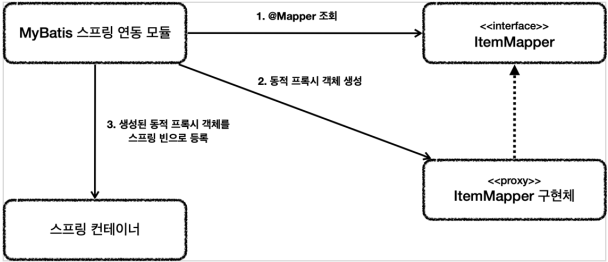 - 마이바티스 스프링 연동 모듈이 만들어주는 `ItemMapper`의 구현체 덕분에 인터페이스만으로 편리하게