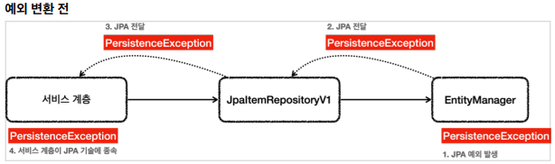 - `EntityManager`는 순수한 JPA기술이고, 스프링과는 관계가 없다. 따라서 엔티티 매니저는 예외가 발생하면 JPA관련 예외를 발생