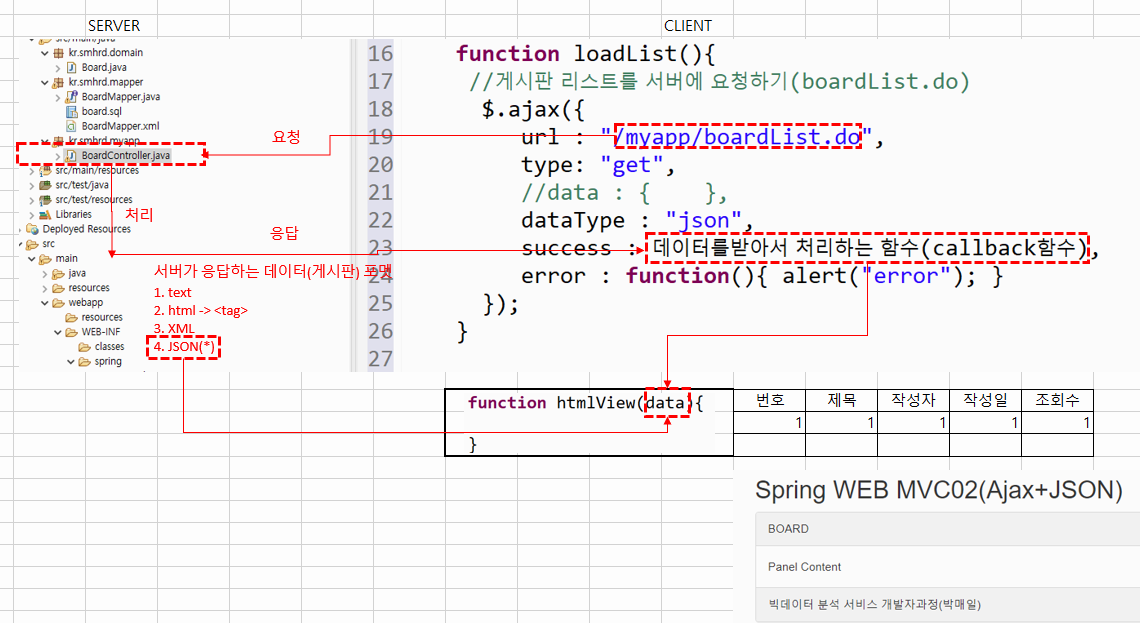 @RequestMapping("/boardList.do") public @ResponseBody List<Board> boardList() { List<Board> list = mapper.selectAll(); // list ---- (Gson) ---- JSON(String) // [{ },{ },{ }] return list; // ajax() 함수 쪽으로 데이터를 전달 }@ResponseBody : 응답을하겠다, 알아서 json코드로 바꿔버림, 주는값이 있든 없든 넣어줌