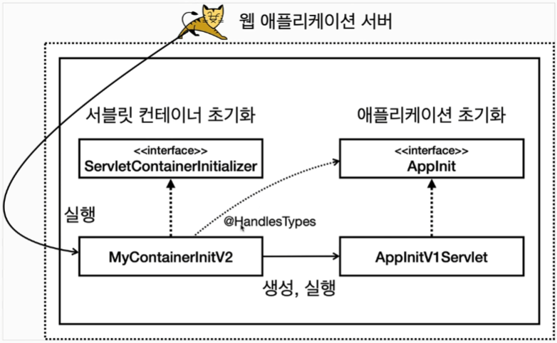 ``` java public interface ServletContainerInitializer { public void onStartup(Set<Class<?>> c, ServletContext ctx) throw ServletException; }- `Set<Class<?>> c` : 조금 더 유연한 초기화 기능을 제공한다. `@HandlesTypes` 애노테이션과 함께 사용한다.