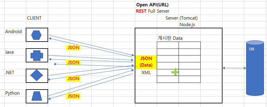 REST : JSON데이터만 제공하는 서버 ex) Open API(URL)
