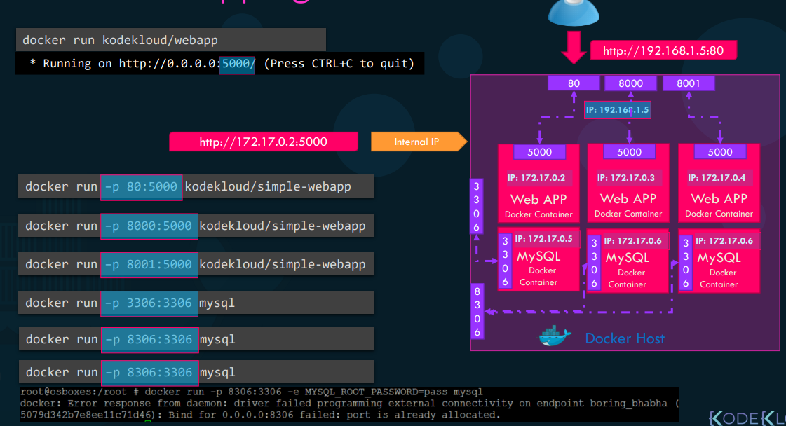 docker run -p 80:5000 kodekloud/simple-webappㆍ도커 호스트 Port : 도커 컨테이너 Port