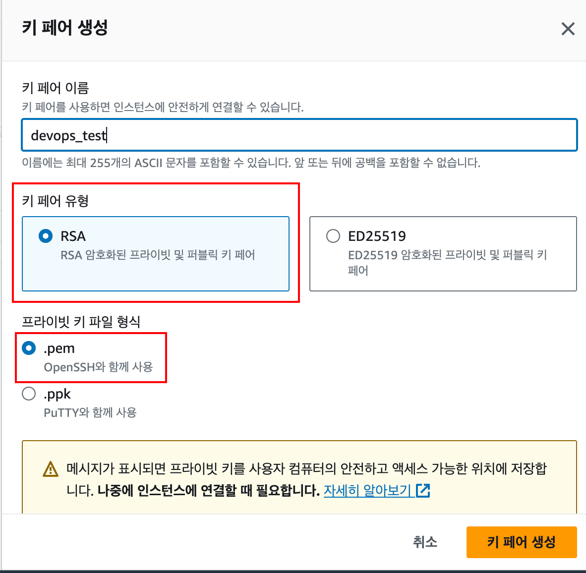 mv ~/Downloads/devops_test.pem ~/.ssh/chmod 600 devops_test.pem- 파일 이동 및 권한 변경