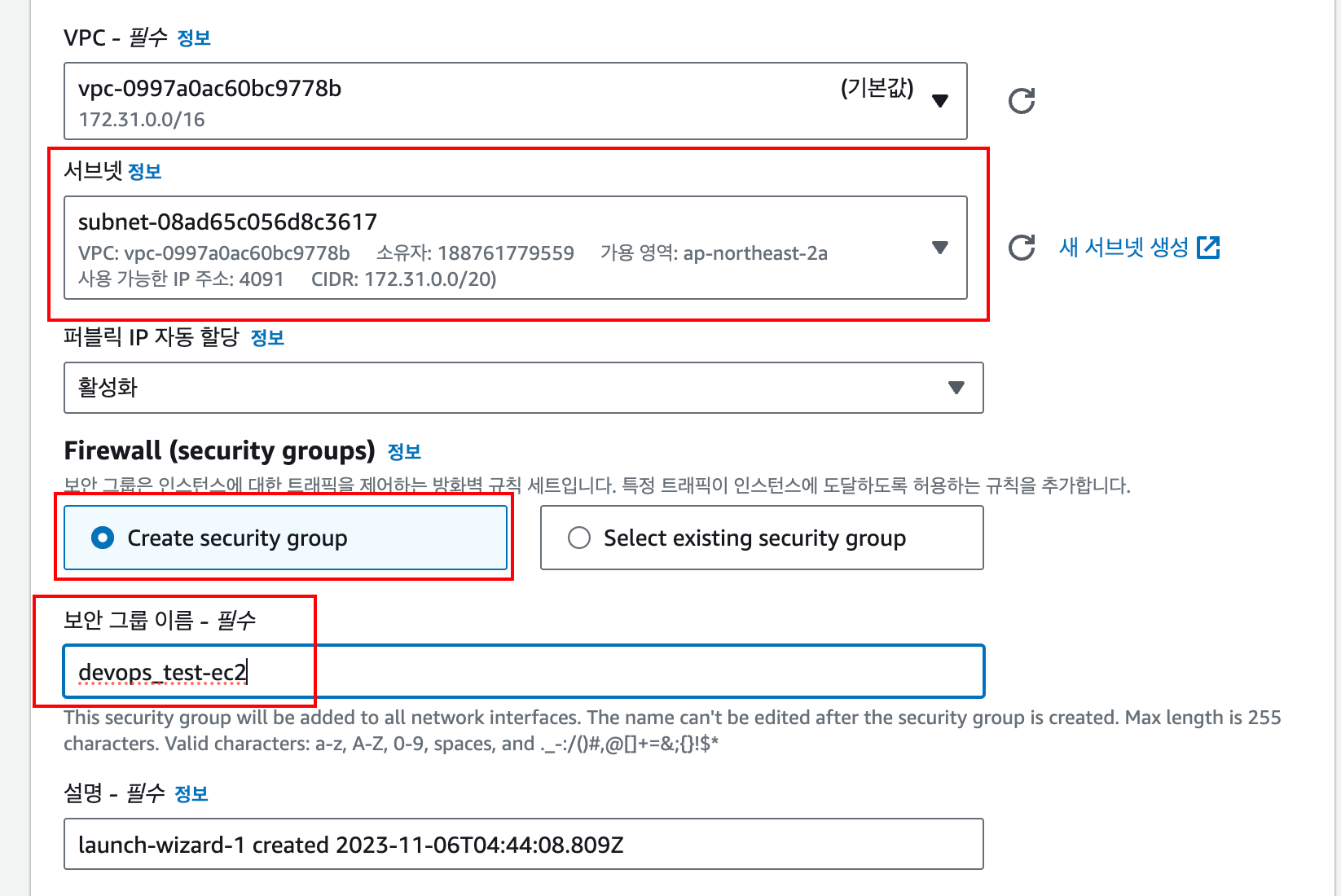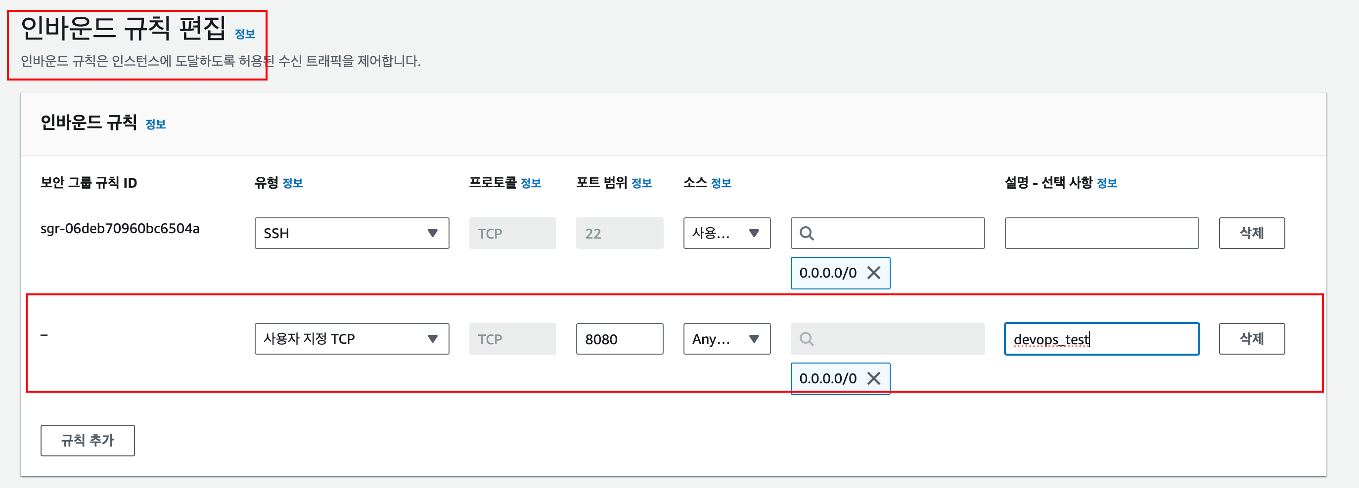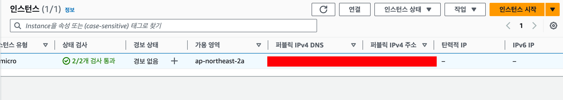 ssh -i ~/.ssh/devops_test.pem ec2-user@퍼블릭 IPv4 주소- ec2-user 는 기본 계정