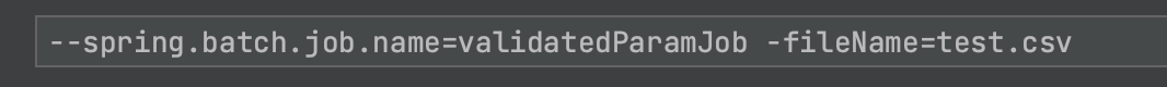 public class FileParamValidator implements JobParametersValidator { @Override public void validate(JobParameters parameters) throws JobParametersInvalidException { String fileName = parameters.getString("-fileName"); System.out.println("validate : " + fileName); if(!StringUtils.endsWithIgnoreCase(fileName, "csv")) { throw new JobParametersInvalidException("This is not csv file"); } } }