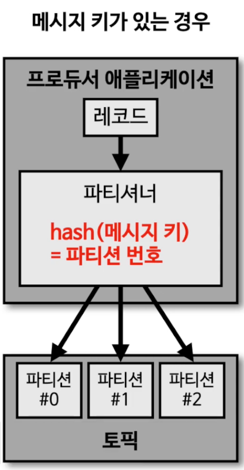 ㆍ2) 키가 있고, 기본 파티셔너 사용할 경우 -> 키의 해시(hash) 값을 구하고, 특정 파티션을 할당