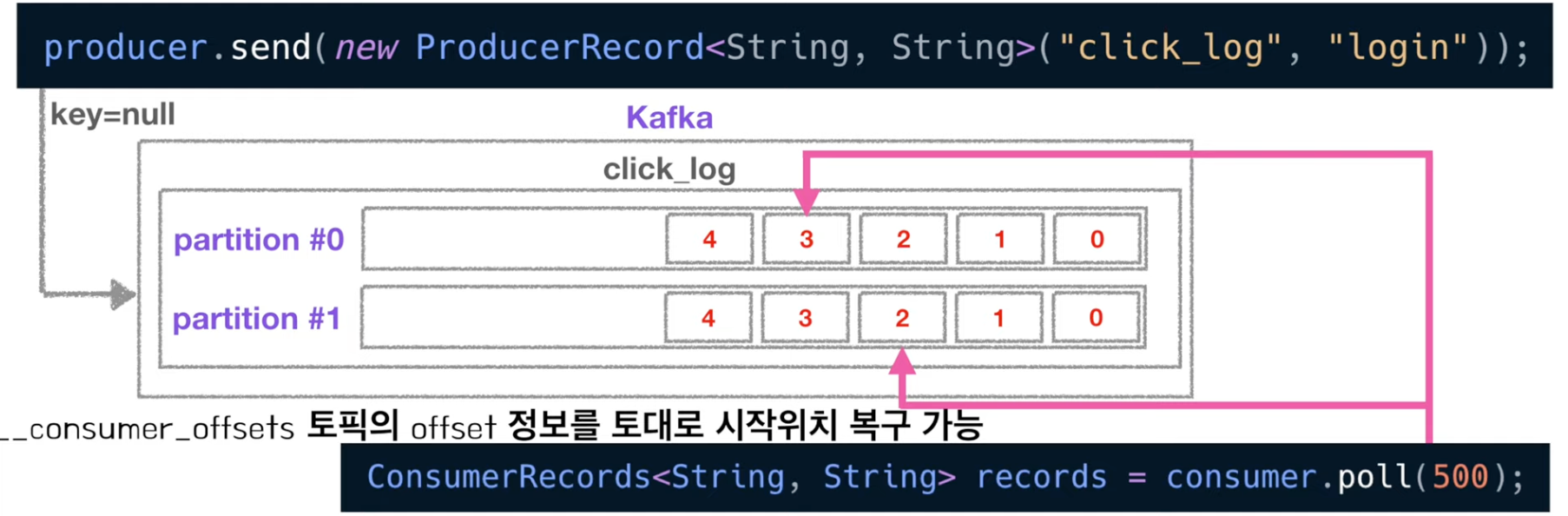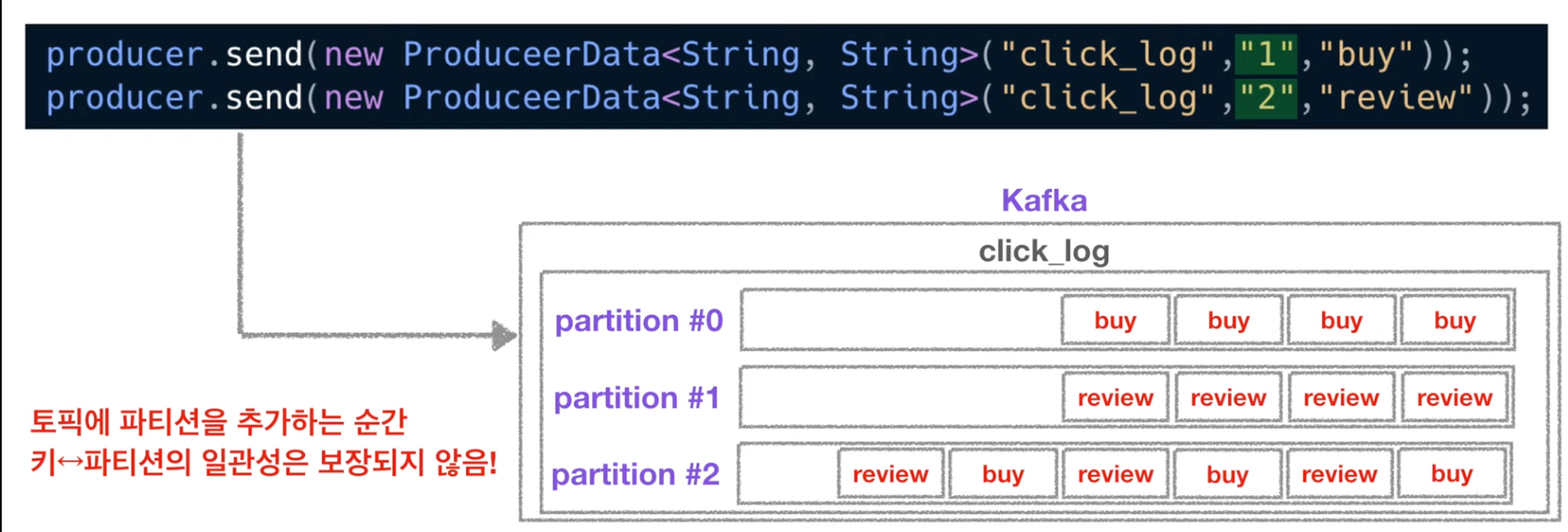 public class Producer { public static void main(String[] args) { Properties configs = new Properties(); configs.put("bootstrap.servers", "localhost:9092"); configs.put("key.serializer", "org.apache.kafka.common.serialization.StringSerializer"); configs.put("value.serializer", "org.apache.kafka.common.serialization.StringSerializer"); KafkaProducer<String, String> producer = new KafkaProducer<String, String>(configs); ProducerRecord record = new ProducerRecord<String, String>("click_log", "login"); producer.send(record); producer.close; } }- 만약 키의 종류가 2개이고 파티션이 3개라면 key와 파티션의 매칭이 깨지기 때문에 key와 파티션 연결은 보장되지 않는다.