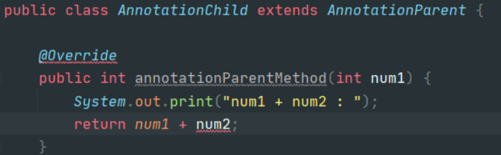 public class AnnotationParent { public int annotationParentMethod(int num1, int num2) { retun num1+num2; } }public class AnnotationChild extends AnnotationParent { @Override public int annotationParentMethod(int num1, int num2) { System.out.print("num1 + num2 : "); return num1 + num2; } }2. 컴파일러에게 문법 체크를 하도록 알린다.
